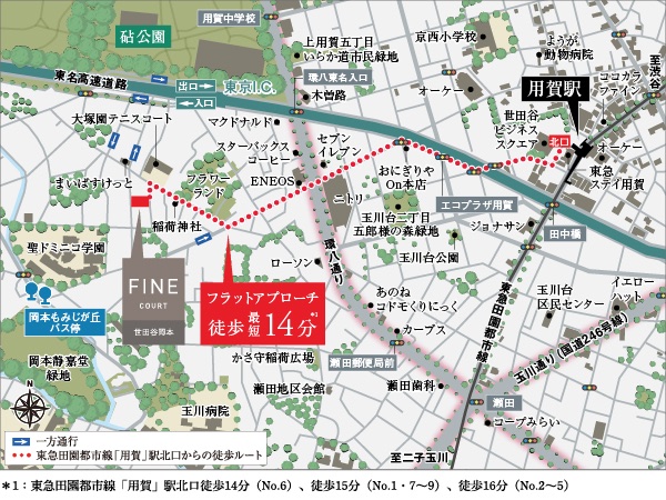 - 東急田園都市線「用賀」駅 徒歩14分~16分 東急田園都市線「用賀」駅への所要時間、徒歩14分(6号棟)、徒歩15分(1号棟・7~9号棟)、徒歩16分(2~5号棟)