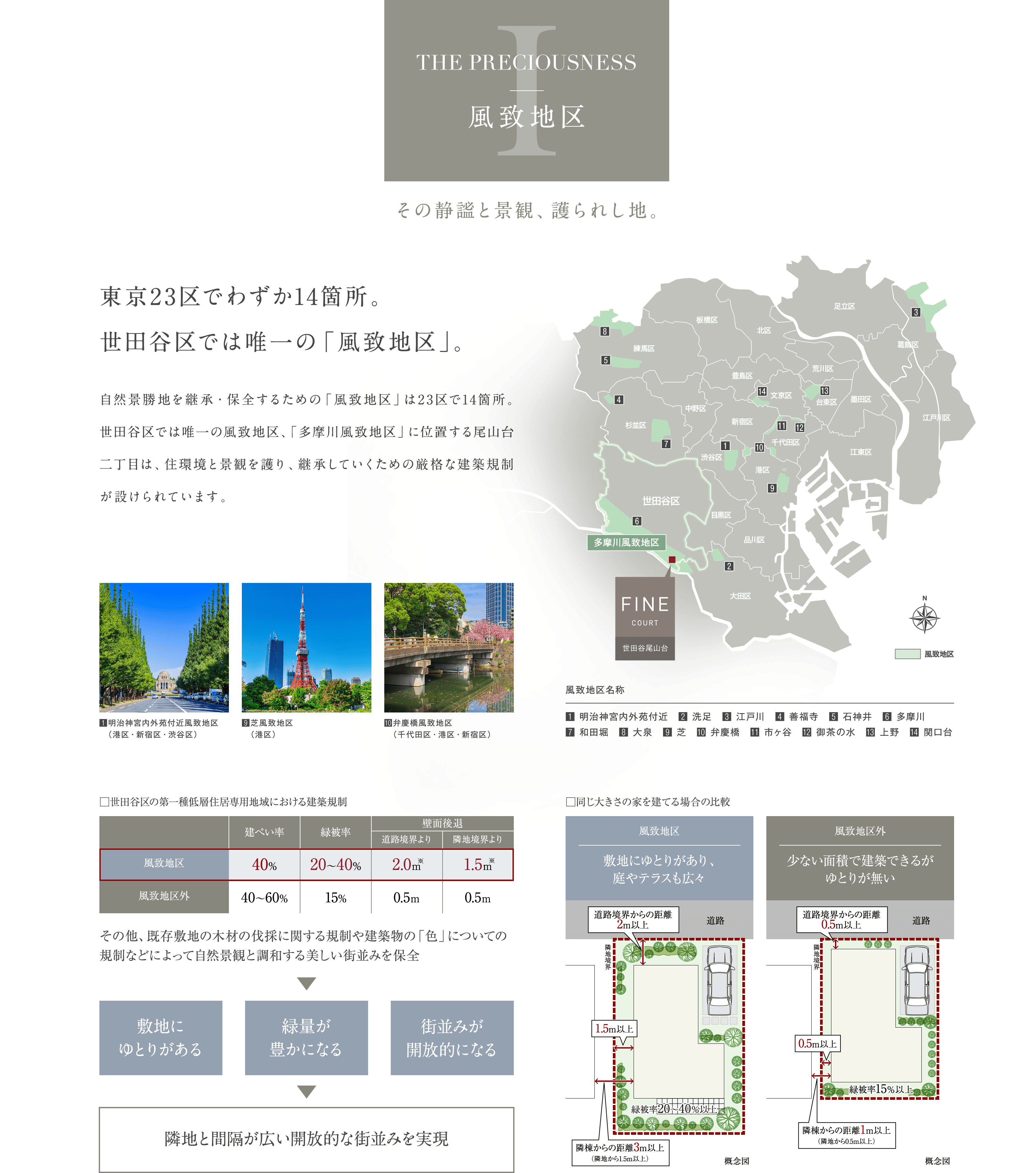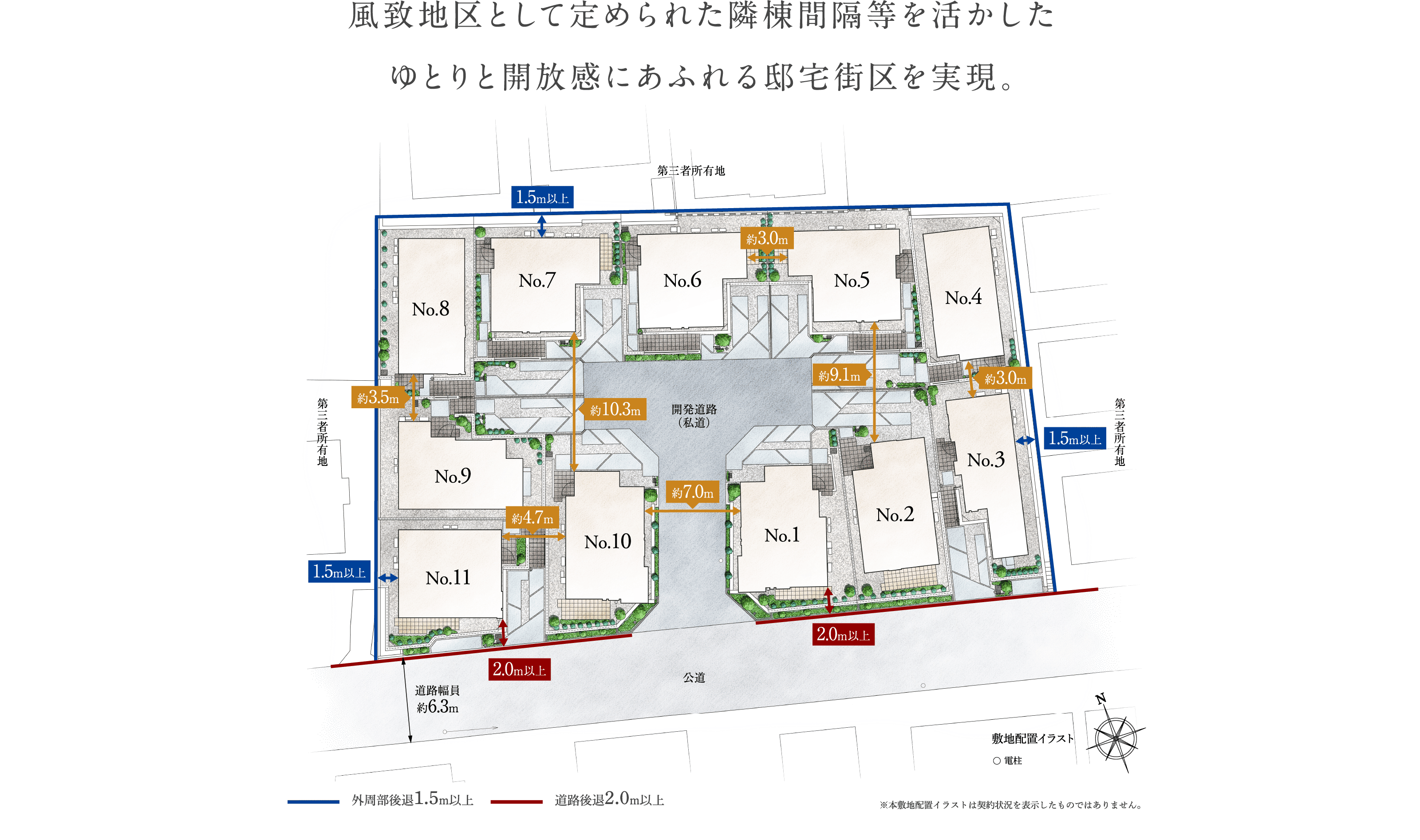 ※本計画に接する近隣住民の土地からは壁面後退距離を1.5m確保しておりますが、本計画内においては、風致地区条例に基づく緩和規定を適用することにより、壁面後退距離が道路境界までの距離2m、隣地境界までの距離1.5mに満たない部分があります。