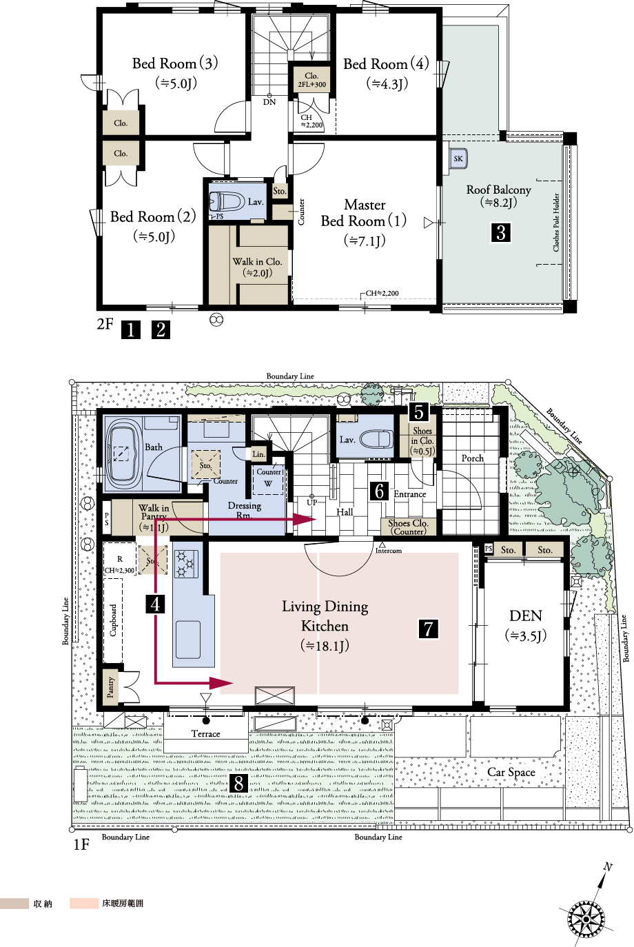 ※掲載の間取りは計画段階の図面を基に描き起こしたもので実際とは多少異なります。※施工等の関係で変更になる場合がございます。詳しくは施工図等でご確認ください。※外構の石、タイル等はおおよその施工範囲を示したものです。※坪数と畳数は約表記です。※DEN=書斎。※J=約畳数。