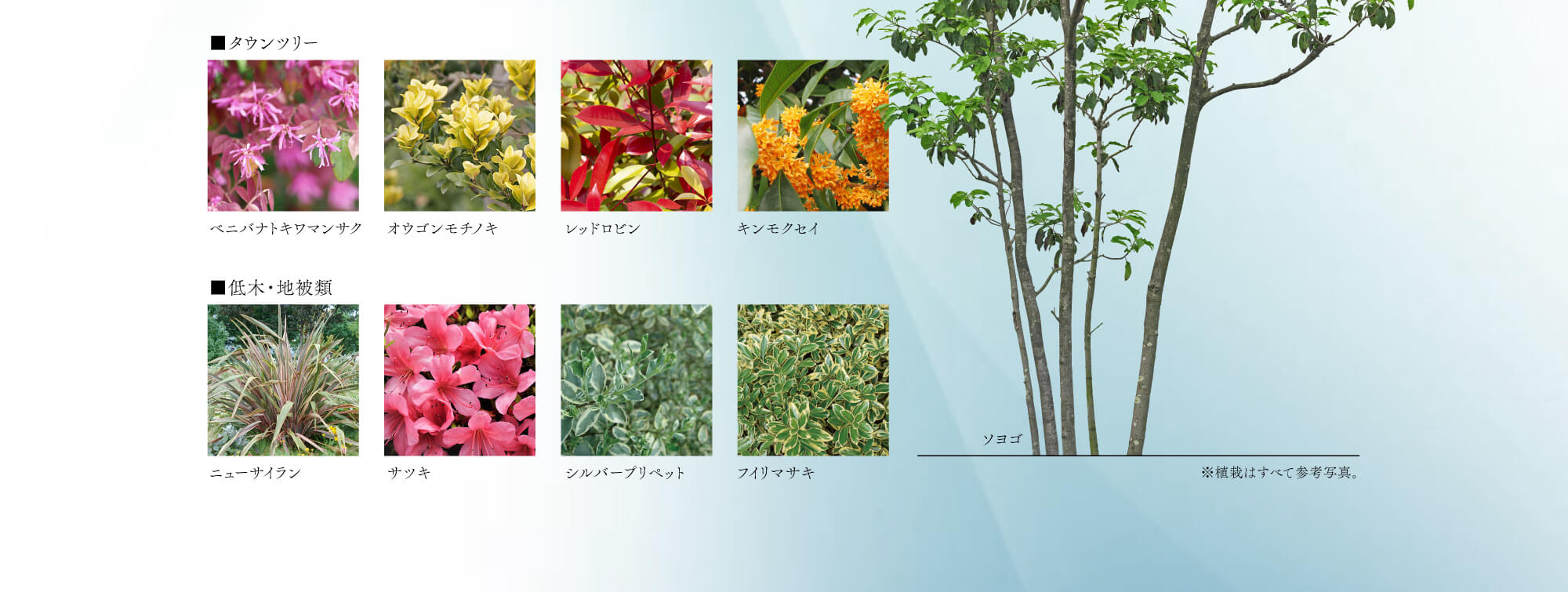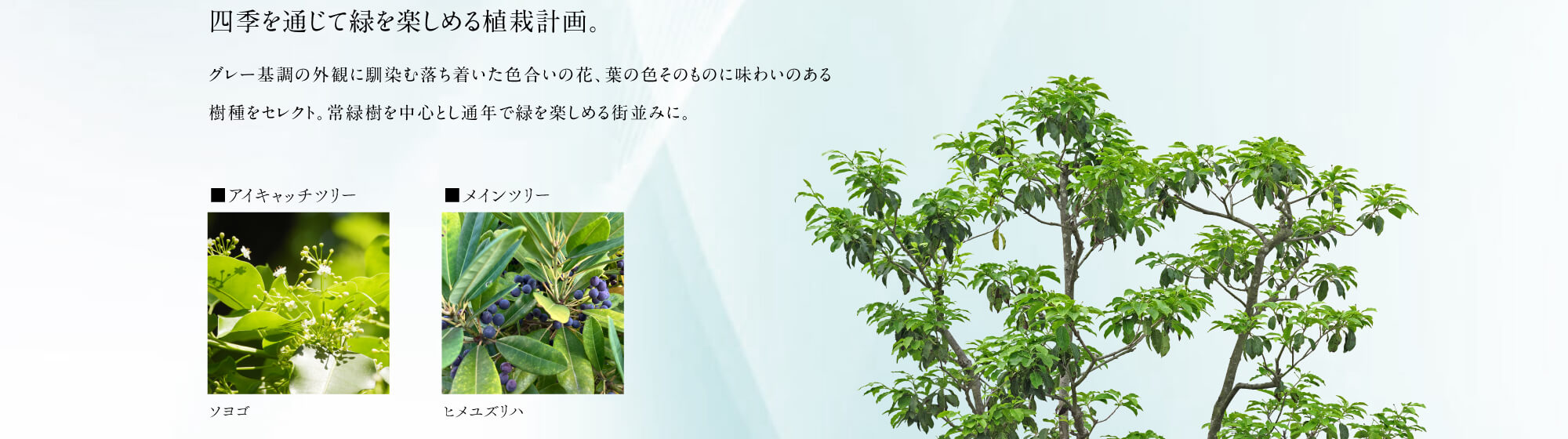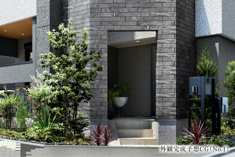 ※掲載の完成予想CGは、設計図を基に作成したもので、形状・色等は実際とは異なります。なお、外観形状の細部、設備機器等は表現しておりません。このCGで表現されている植栽は竣工から初期の育成期間を経た状態のものを想定して描いており、竣工時は植物の生育を見込んで必要な間隔をとって植えております。※家具・調度品等は販売価格に含まれません。