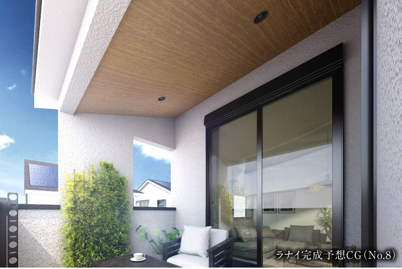 外部と室内をつなぐラナイ部分の軒天には木調素材を採用。