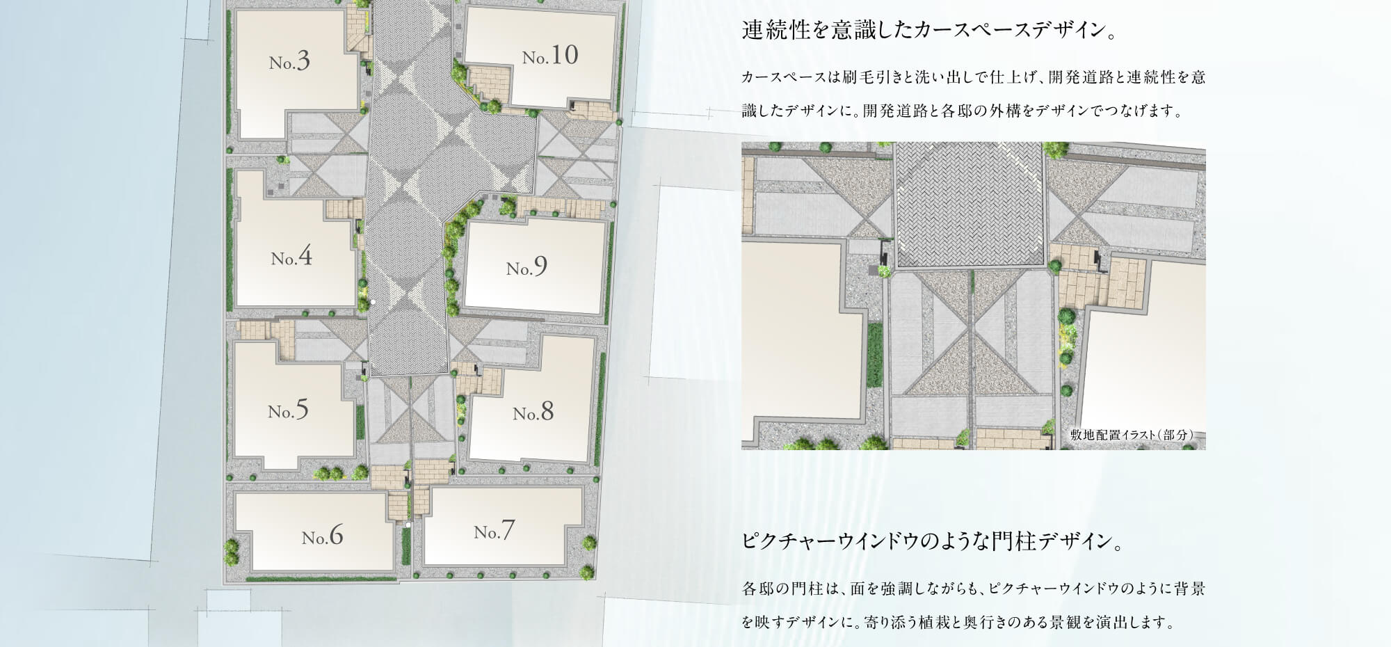 壁面を2〜3重と後退させる部分をあえて設けることで、フォルムの奥行きを演出。重なるウォールが一邸一邸の味わいをさらに深めます。