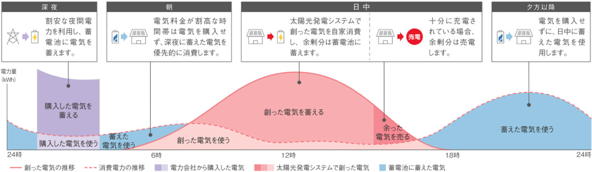 ●グリーンモードの一例です。●グラフは晴れた日のイメージです。「蓄えた電気を使う」「購入した電気を使う」などの切り替え時間はご家庭の消費電力やお客様の設定時刻によって異なります。●蓄電システムは定期的に満充電を行うことによって、蓄電池の状態を保つ設計となっています。性能を十分に発揮するために、1週間に1回程度の満充電が必要です。