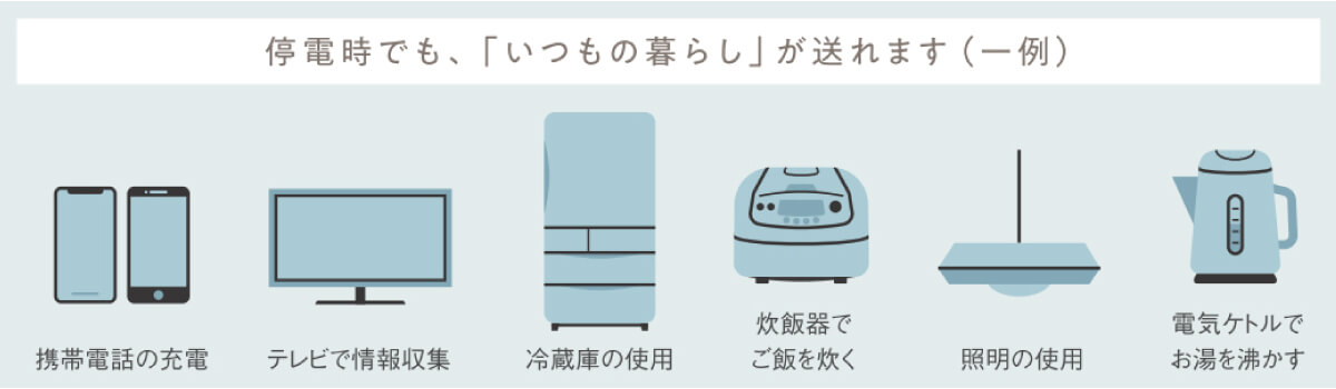 蓄電池は光熱費の節約だけではなく、万が一の災害時にもご利用いただけます。もし停電が起きても、照明、テレビ、冷蔵庫、携帯電話などの使用が可能です(※)。さらに、日中発電時には太陽光発電も併用することで、より継続して電気を使うことができます(*2)。
