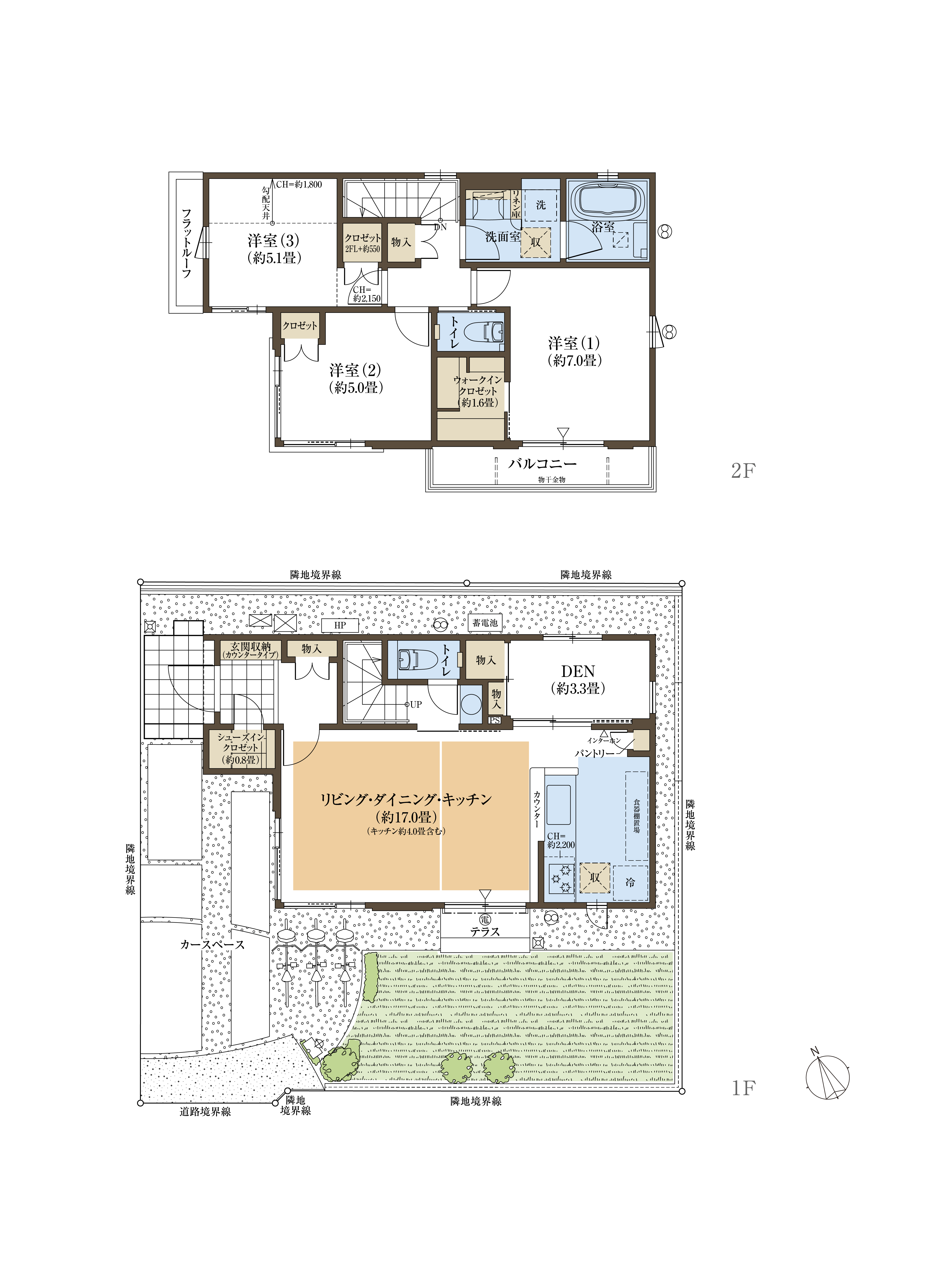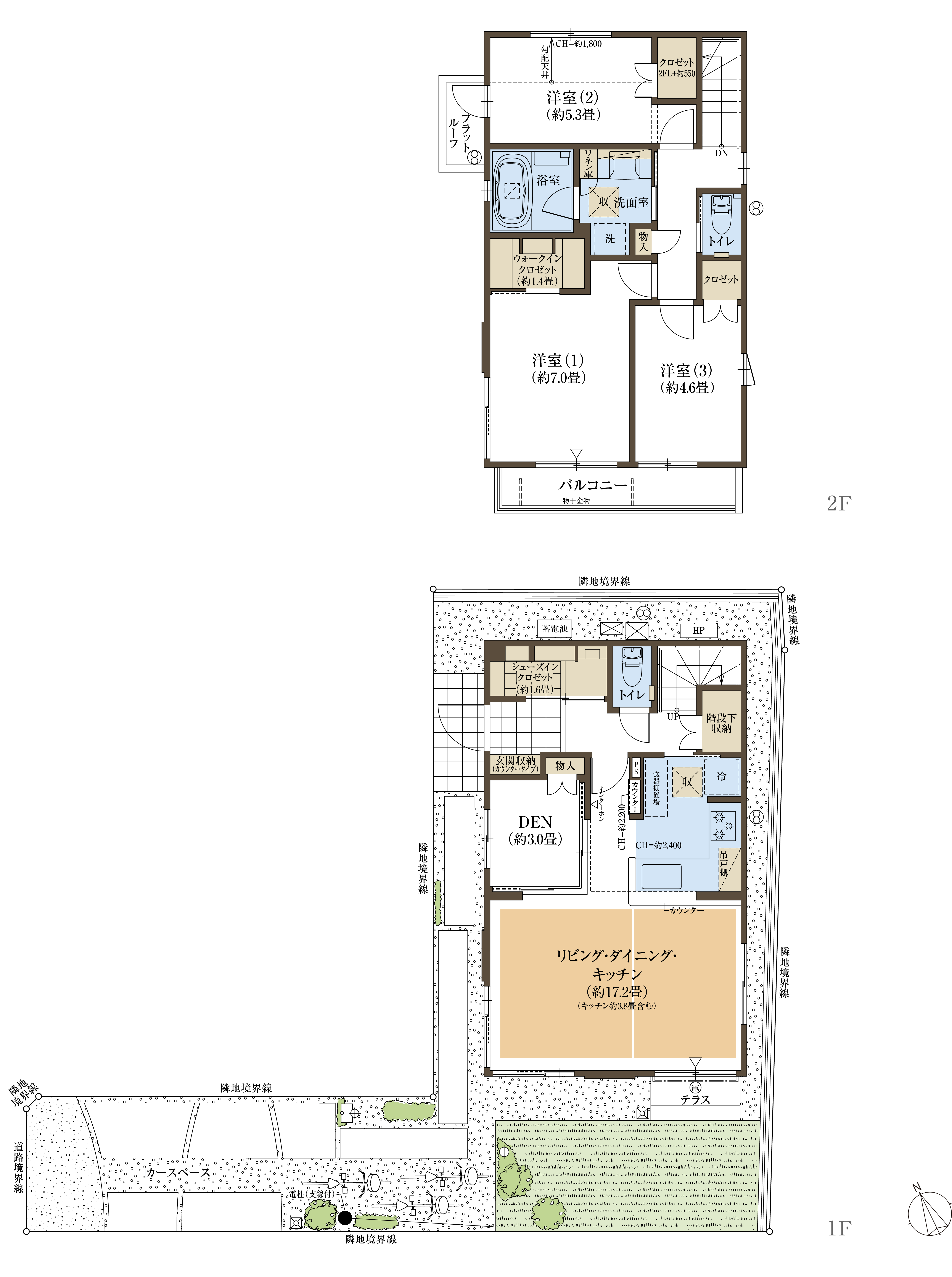 ※掲載の完成予想イラスト・敷地配置イラストは設計図を基に作成したもので、形状・色等は実際とは異なります。外観形状の細部・設備機器等は表現しておりません。表現されている植栽は施工から初期の育成期間を経た状態のものを想定して描いております。施工時は植物の育成を見込んで必要な間隔をとって植えております。家具・調度品は販売価格に含まれません。予めご了承ください。