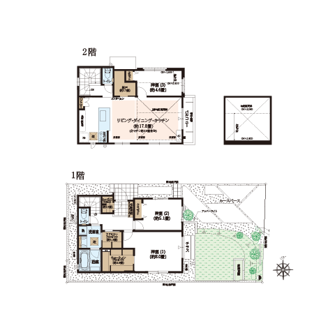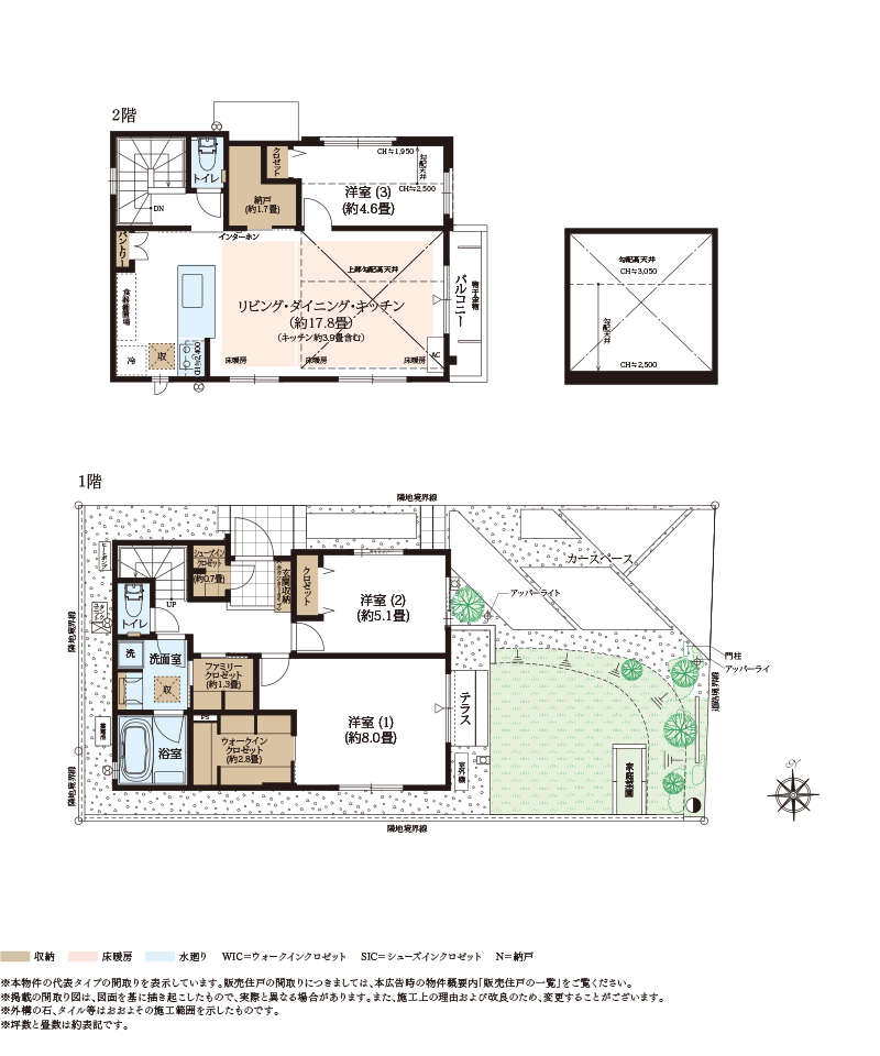 ※外構の石、タイル等はおおよその施工範囲を示したものです。家具・調度品等は販売価格に含まれません。
