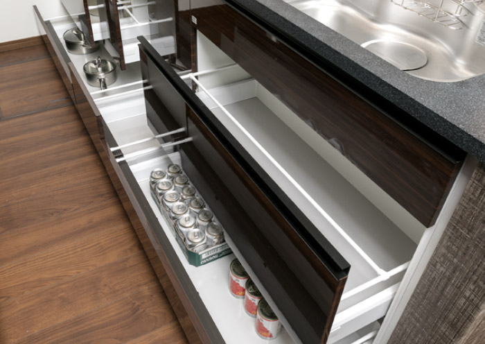 奥までしっかり利用でき、鍋やフライパンなども効率的に収納できます。スライド式で軽く引き出せるので、重い物も安全に取り出せます。