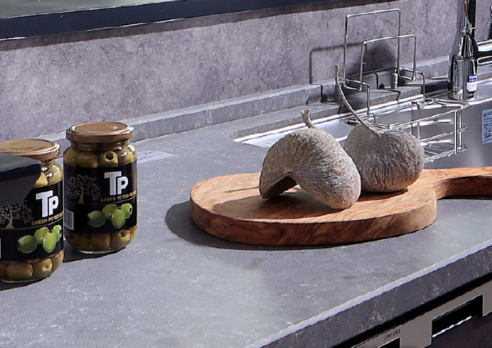 キッチンのカウンタートップには、天然水晶を主成分としたフィオレストーンを採用しました。