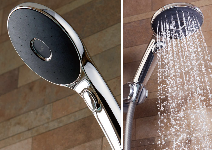 ヘッドが引き出せるのでお手入れや洗髪時に便利。目の細かいシルキーシャワーは肌触りがよく、水ハネを防ぎます。
