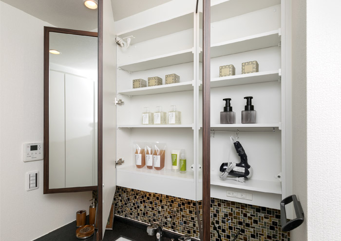 洗面室をスッキリ見せるため、三面鏡の裏側に収納スペースを設置。化粧品や洗面小物などをまとめて収納できます。左右のミラーを向かい合わせるように開くと、後ろ姿も確認できます。