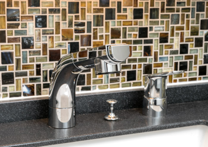 洗面台の鏡の下に施したモザイクタイル。高級感あるアクセントになっています。