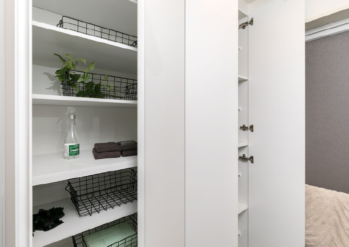 バスタオルやハンドタオル、洗面台周りの小物を収納できる便利なスペースを全邸に設置しました。