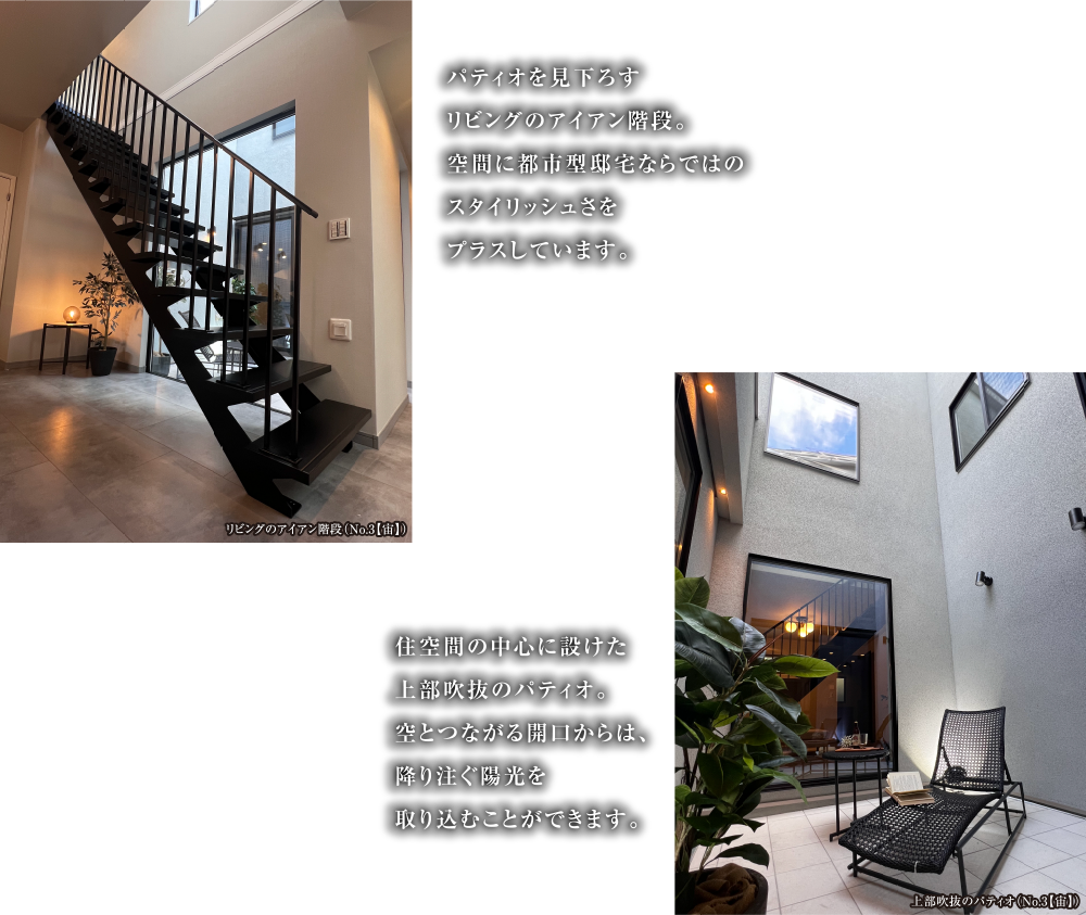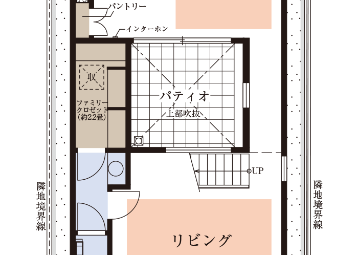 リビングとダイニングキッチンの間に、上部吹抜のパティオを設置。パティオの開口からは、各居室はもちろん、廊下や階段にも降り注ぐ陽光を取り込むことができます。