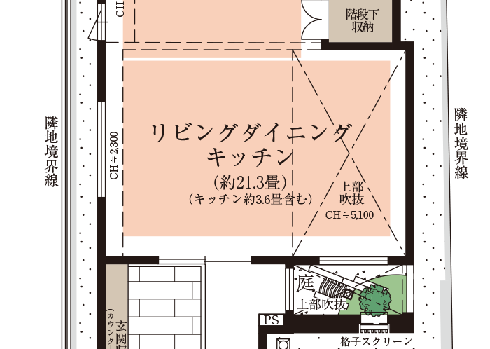 約21.3畳のLDKは、天井高約5.1m※の開放感あふれる空間。また広々とした玄関とリビングからは、ガラス越しに和モダンのテイストに設えた坪庭を眺めることができます。