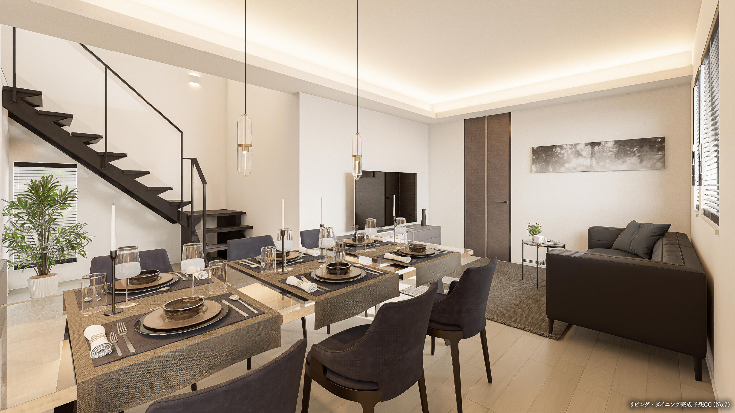 ※掲載の街並み完成予想CGは設計図を基に作成したもので、形状・色等は実際とは異なります。外観形状の細部・設備機器等は表現しておりません。 表現されている植栽は竣工から初期の育成期間を経た状態のものを想定して描いております。竣工時は植物の生育を見込んで必要な間隔をとって植えております。家具・調度品等は販売価格に含まれません。予めご了承ください。