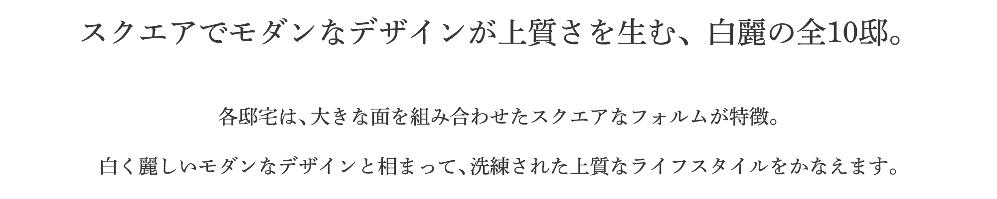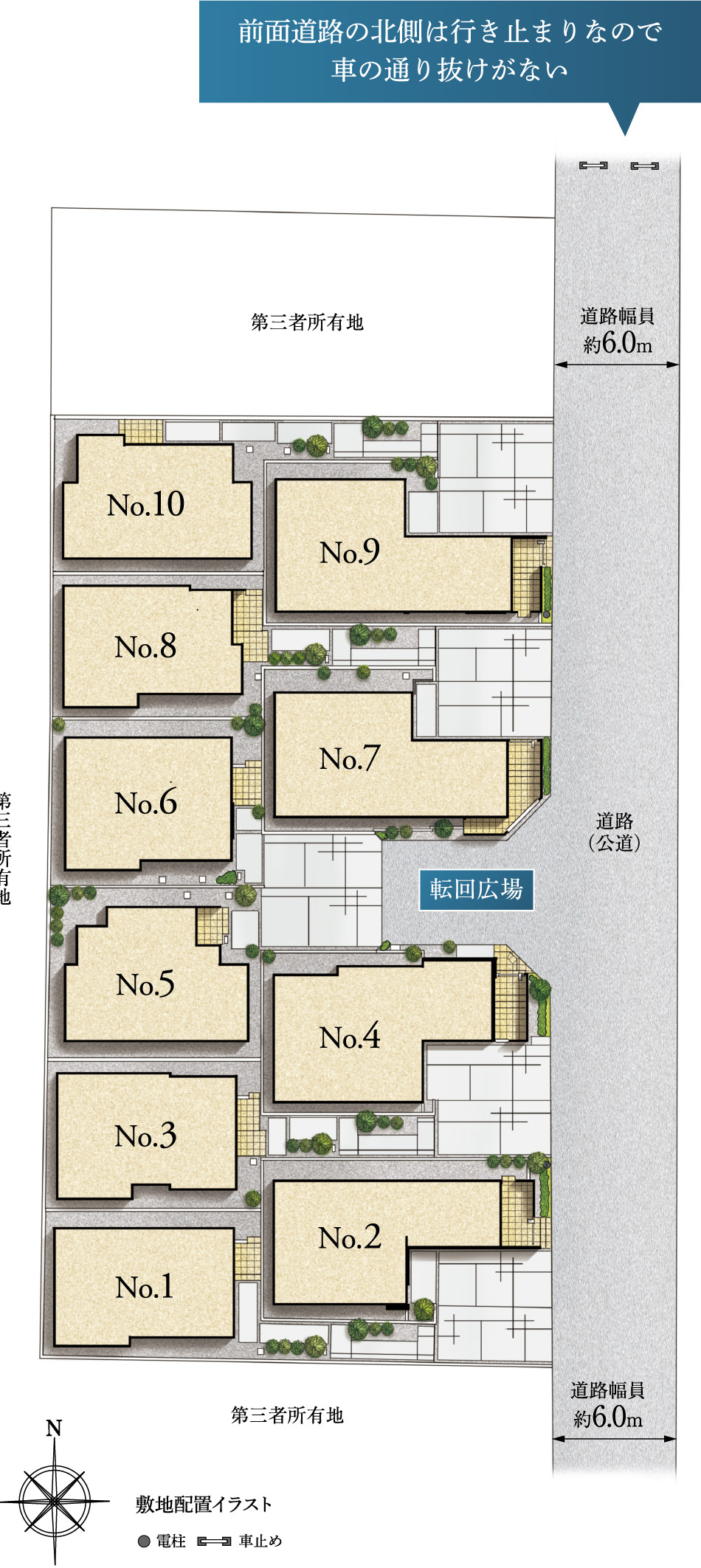 全10邸の白亜の街並みが面しているのは、新しく開発された約6mの公道。また、計画地の中央に転回広場を設けたことで、広々とした開放感を実現しました。