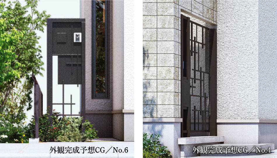 外観のダイナミックさを象徴する印象的なバットレス。スタイリッシュなデザイン門扉と合わせ、高いプライバシー性を発揮します。