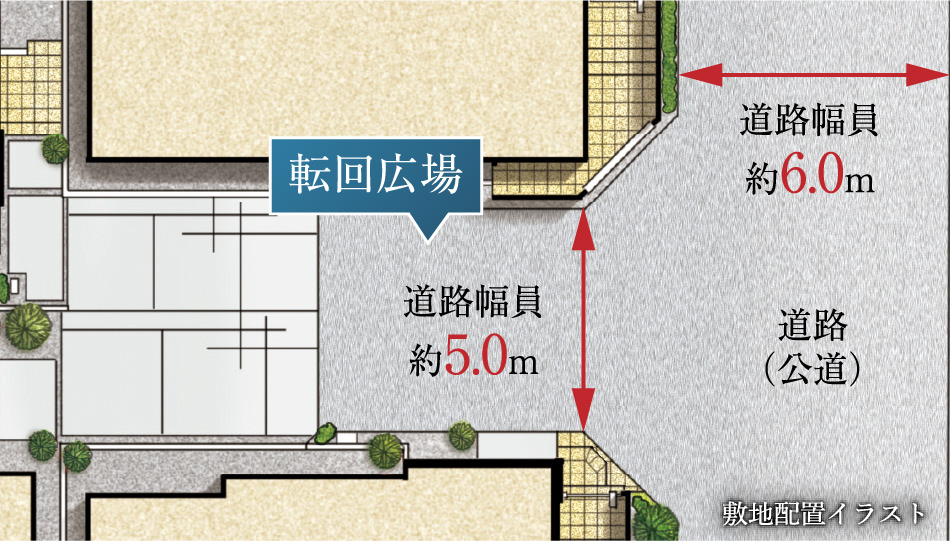約6mの前面道路と転回広場が大きな開放感を実現。