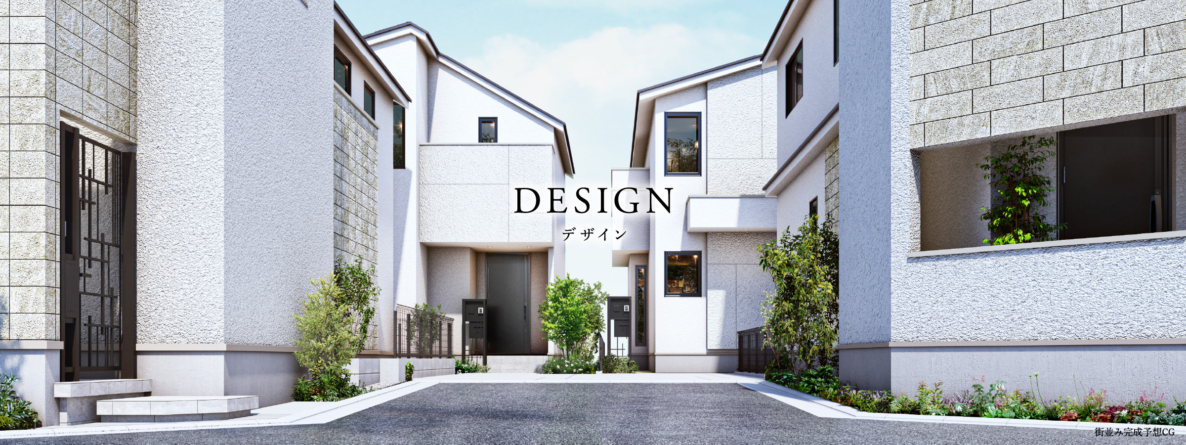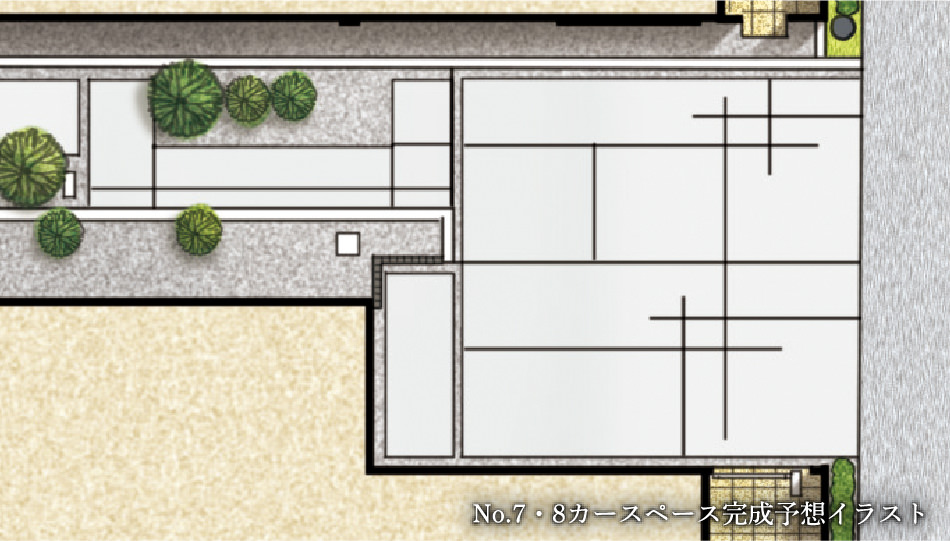 各邸宅に設けたカースペースは、2軒分2台が連続するカタチで配置。コンクリート刷毛引き舗装に自然石のボーダーを施した、“面と線の対比”で魅せるデザインで、街並みの洗練された佇まいを引き立てます。