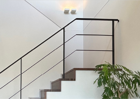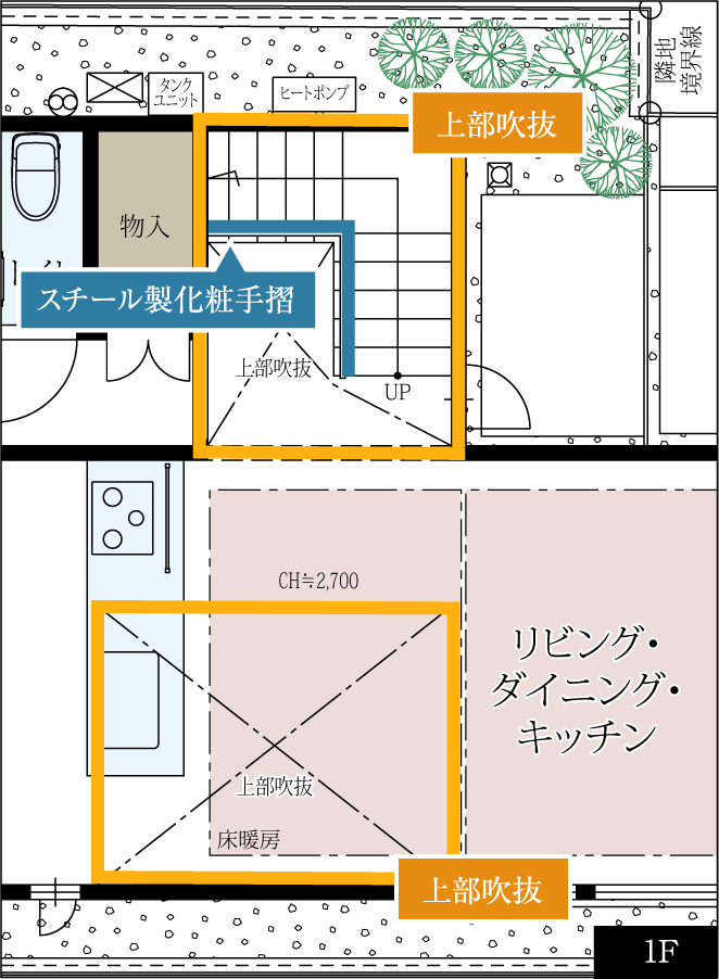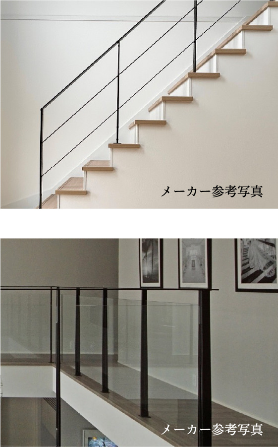 大きな吹抜のあるダイニング・キッチンから、2階の廊下に配した透明なガラス手摺を仰ぎ見ることができるプランも魅力的。また、スチール製化粧手摺を採用したリビングイン階段にも、開放感あふれる上部吹抜を設け、ドラマティックな空間構成としました。