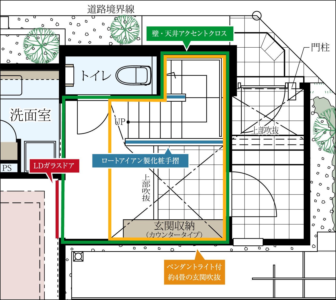 約4畳の吹抜を持つ玄関ホールにペンダントライトが輝き、ロートアイアン製の階段化粧手摺が優美な趣を演出。さらに、上品なアクセントクロスと、光を導くLDガラスドアが、洗練された美しい時間を描きます。