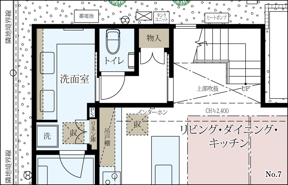 シースルーのリビングイン階段と吹抜が、軽やかな寛ぎを創出。(No.7)