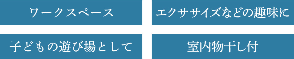 LDKからガラス引き戸で続く、開放感にあふれたDEN空間。床にスタイリッシュで耐傷性能に優れたフローリング「コンカーボ」を採用したほか、カウンターや室内用物干しも設置。エクササイズ、お子さまの遊び場、ワークスペース、物干しスペースなど、多彩に使える空間です。