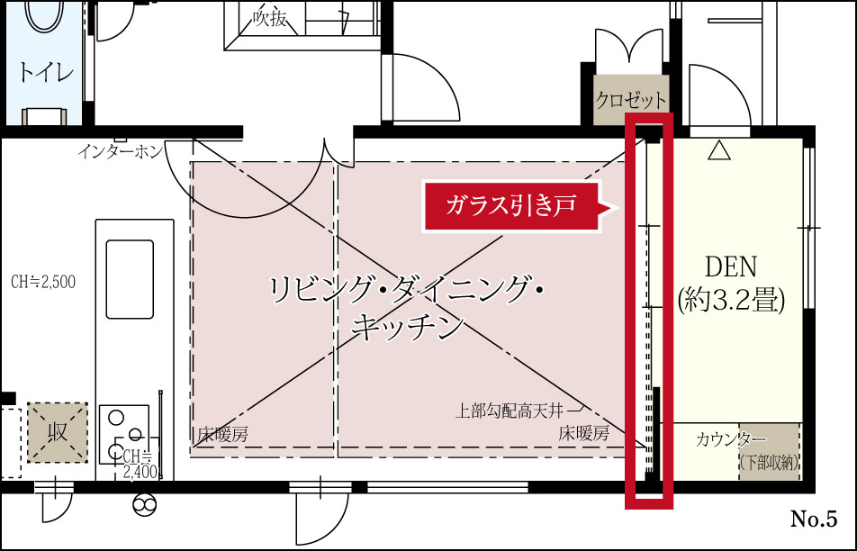 大きな吹抜のペンダントライトとLDガラスドアが印象的。(No.4)