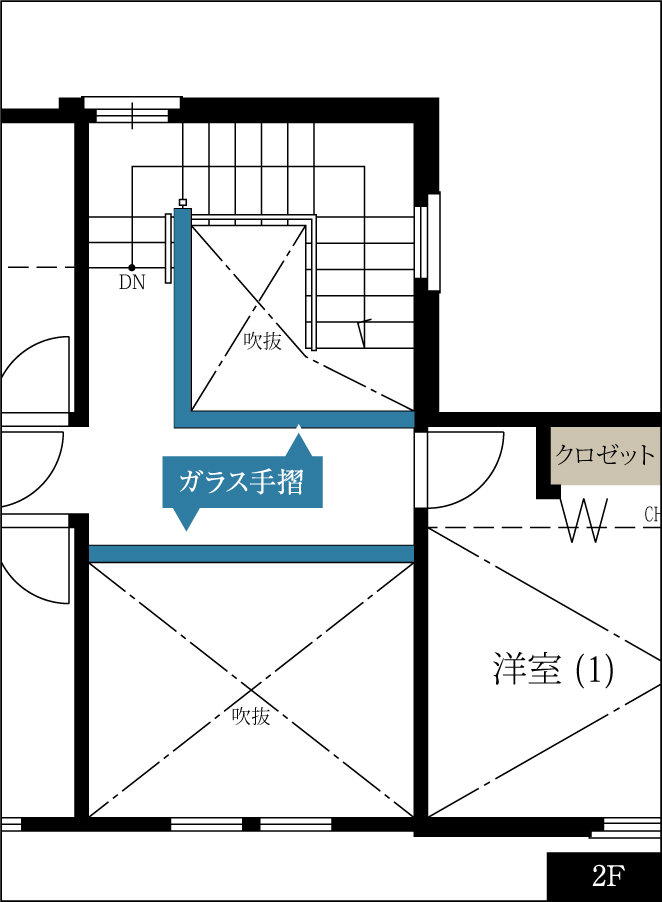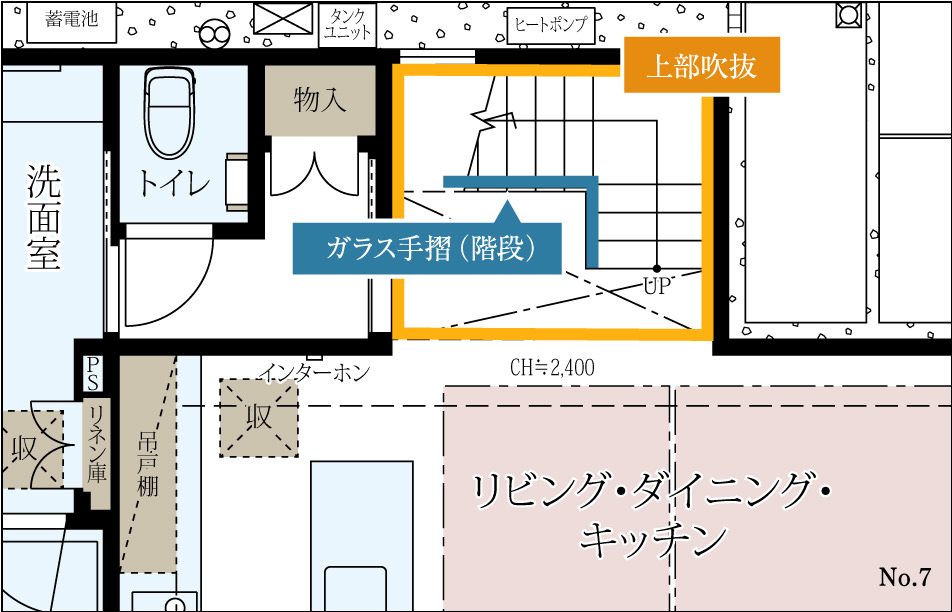 透明なガラス手摺を仰ぎ見る吹抜と、リビングイン階段の吹抜がドラマティック。(No.9)