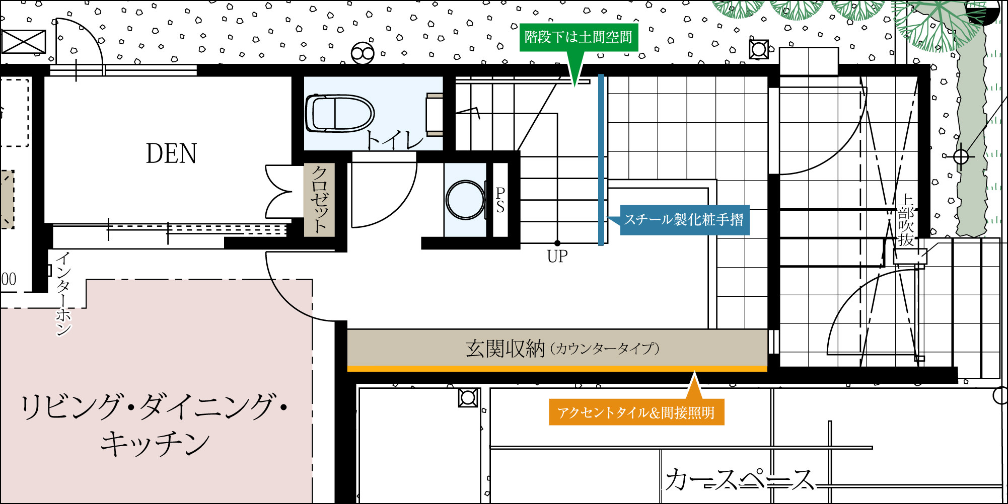 約9畳のゆとりある玄関ホールが、家族とお客さまを邸宅らしい品格で迎えます。また、スチール製の化粧手摺がモダンな印象を添え、カウンタータイプのワイドな玄関収納にはアクセントタイルと間接照明を設置。さらに、階段下に設えた土間空間が、日々の暮らしにやすらぎと便利さをもたらします。