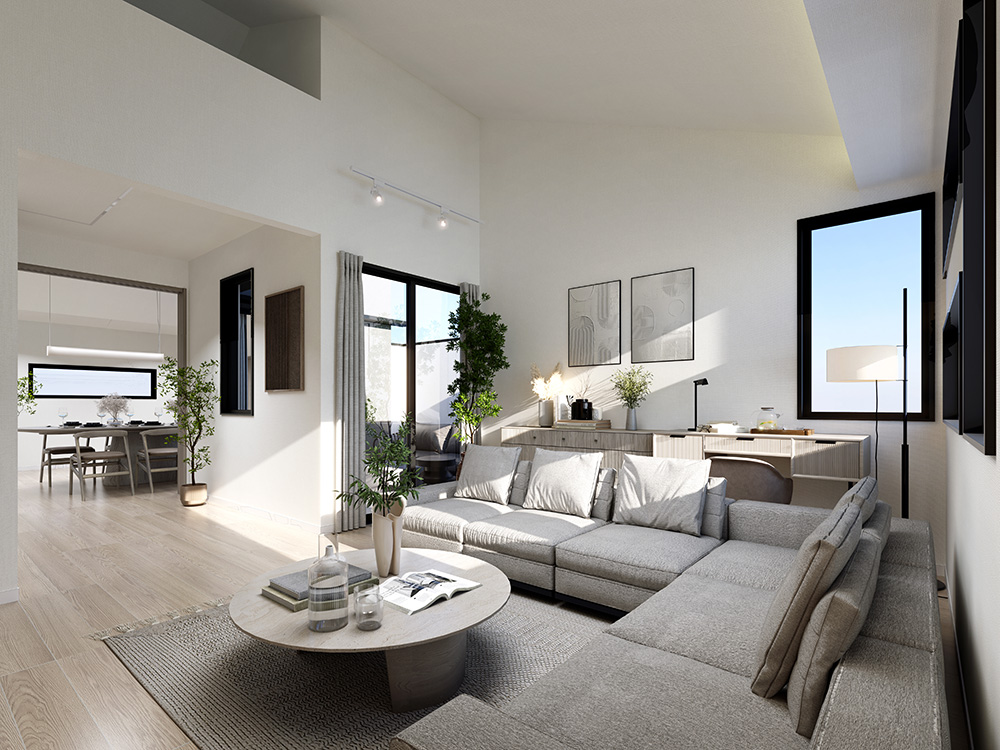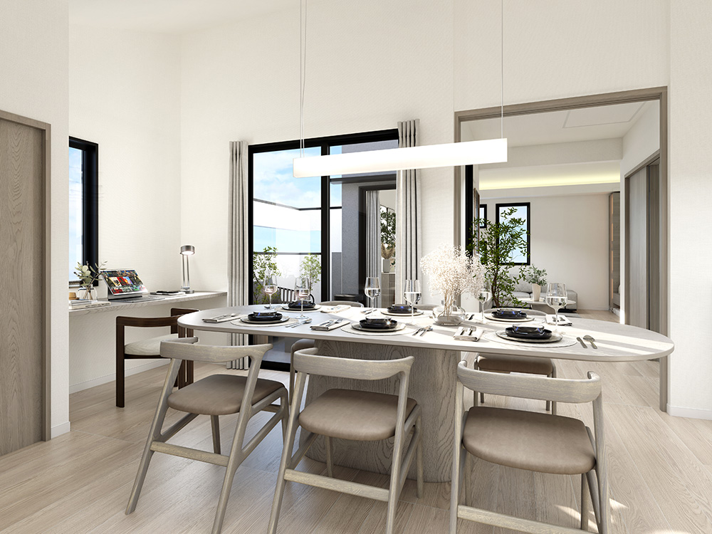 ※掲載の完成予想CGは設計図を基に作成したもので、形状・色等は実際とは異なります。外観形状の細部・設備機器等は表現しておりません。 表現されている植栽は竣工から初期の育成期間を経た状態のものを想定して描いております。竣工時は植物の生育を見込んで必要な間隔をとって植えております。家具・調度品は販売価格に含まれません。