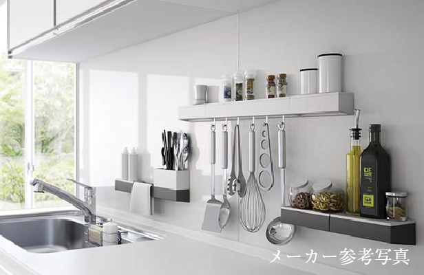 油などを簡単に拭き取ることができるホーロー製のキッチンパネル。マグネットで調理器具などの設置も可能です。