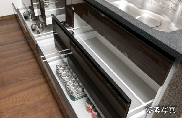 奥までしっかり利用でき、鍋やフライパンなども効率的に収納できます。スライド式で軽く引き出せるので、重い物も安全に取り出せます。