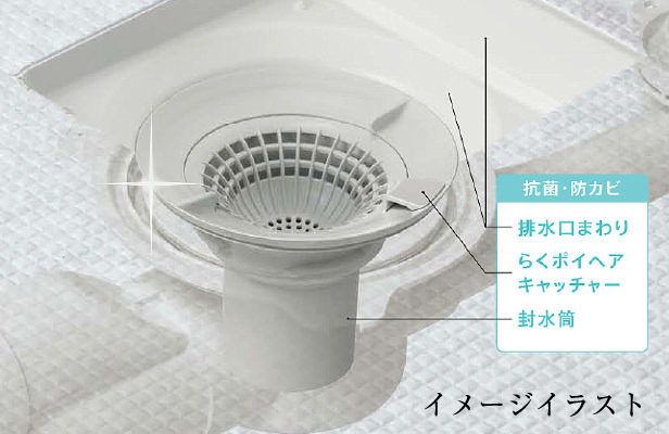 凹凸が少なく、汚れが落としやすい形状。さらにトラップカバーを開けて見える部分すべてが抗菌・防カビ効果を持つ樹脂で、ぬめりやカビ汚れの増殖を抑えます。