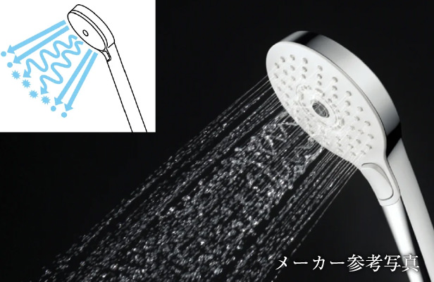 大粒の水玉が左右にスイングしながら勢いよく吐水する、ウエーブ吐水を搭載。スプレーシャワーとのミックスによる適度な刺激感のある浴び心地と節水を実現。