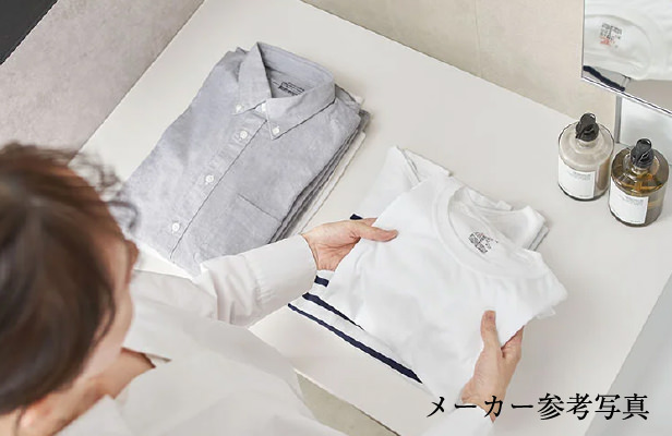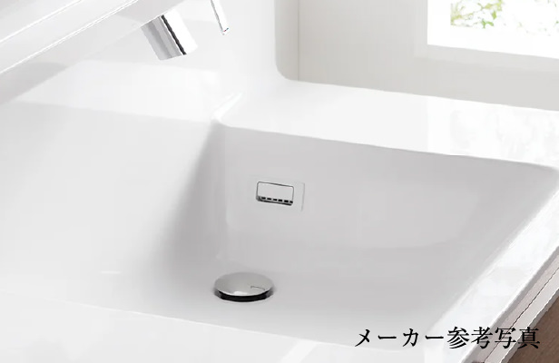 スペースたっぷりのカウンターで、洗面も家事もスムーズに。カウンター下のオープンスペースは、イスやカゴなどを置いて活用できます。※No.2に採用