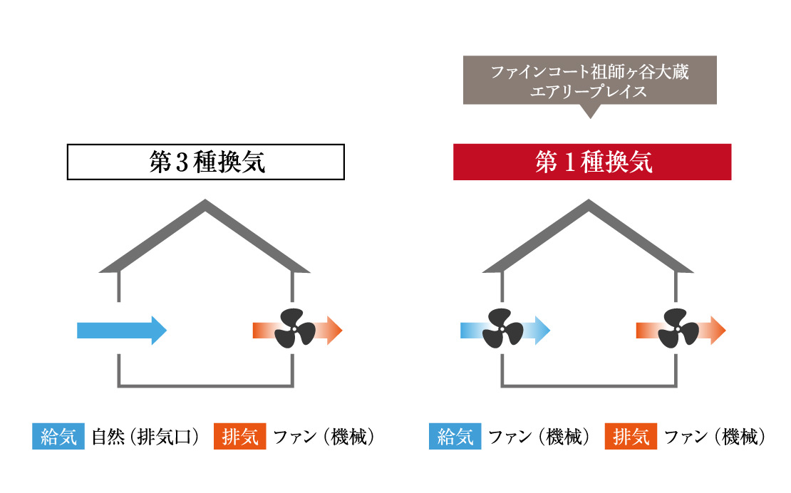 第1種換気は、給気・排気の両方を機械で制御する換気方式です。安定的に新鮮な空気を取り入れ、汚れた空気を効率よく排出できるため、快適で健康的な室内環境を保つことができます。