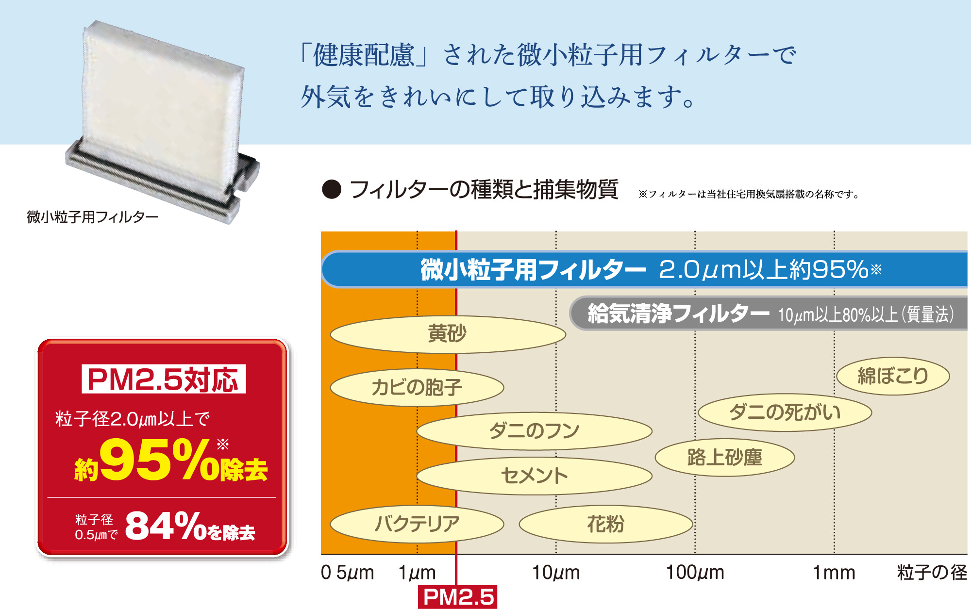 ※50㎥/h運転時。対象商品を通過する空気に含まれる粒子数を粒径別に測定し、ワンパス(1回通風)捕集効率をメーカー基準により評価したものです。捕集効率は風量によって異なります。0.5μm未満の微小粒子状物質については除去の確認ができていません。また、空気中の有害物質すべてを除去できるわけではありません。PM2.5とは2.5μm以下の微小粒子状物質の総称のことです。