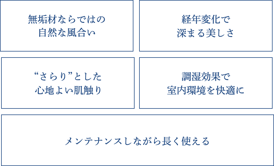 無垢フローリングは、木の温もりが感じられる心地よい足触りと、湿度を自然に調整する調湿性で快適な室内環境を実現します。自然な木目や色合いが空間にあたたかみを与え、経年変化によって深まる風合いも魅力。デザイン性と快適性を兼ね備えた床材です。