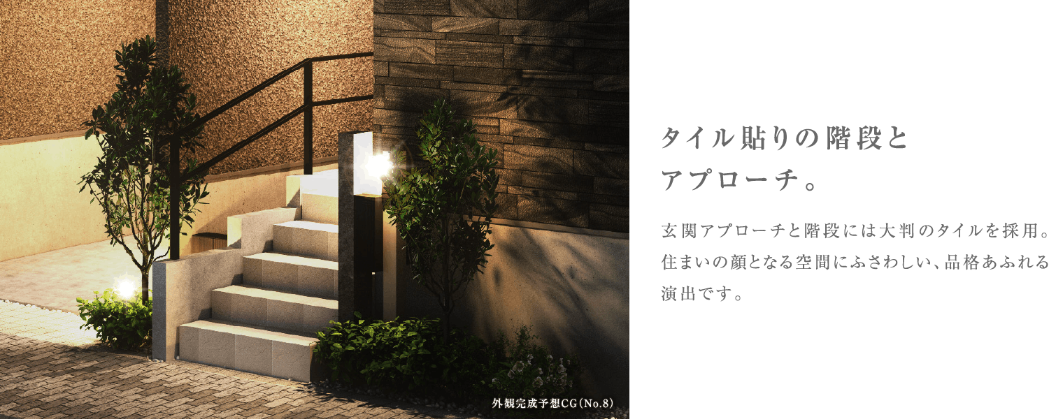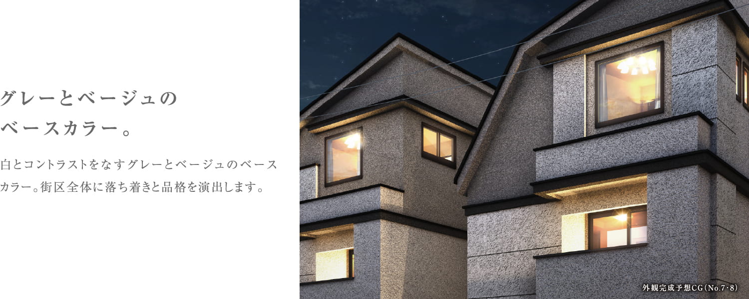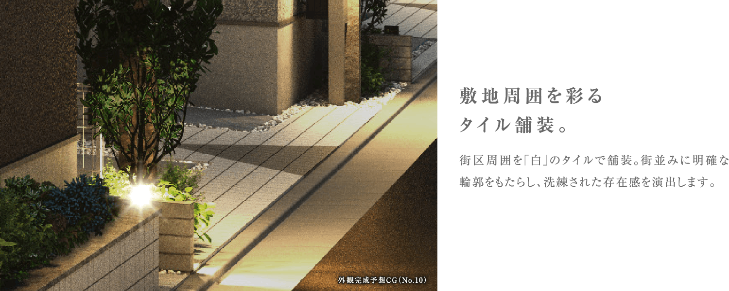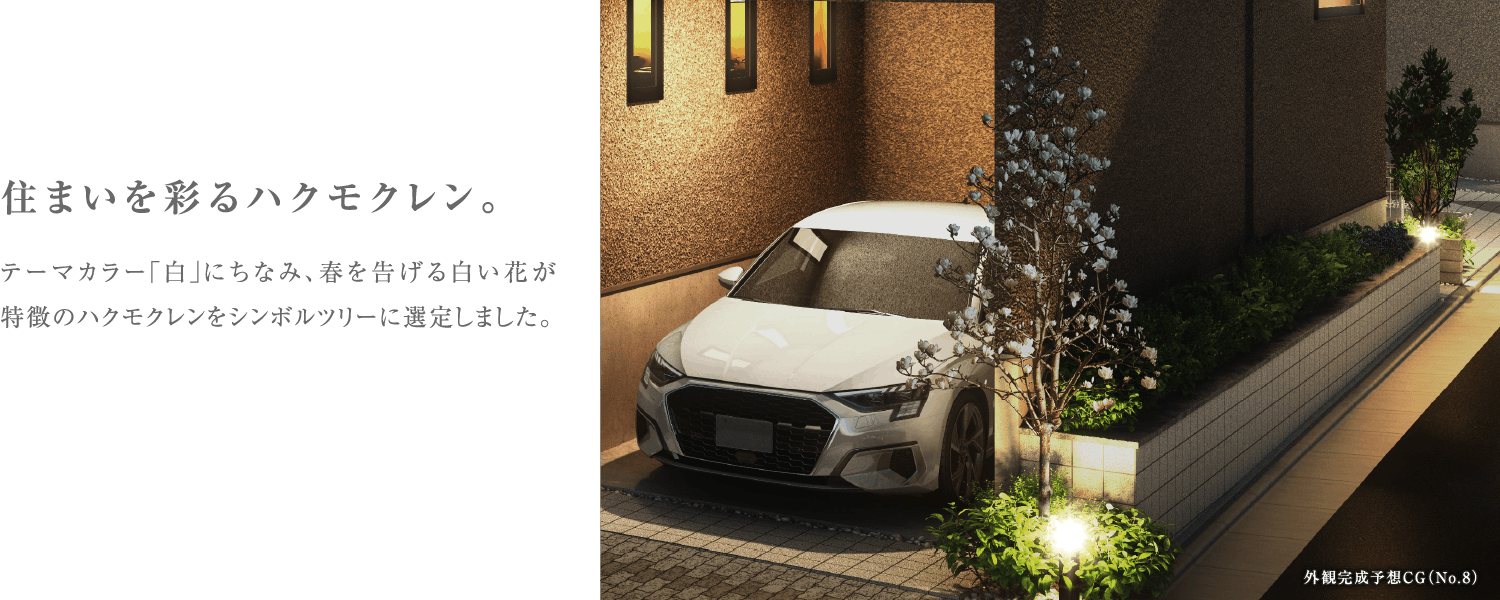 ※掲載の完成予想CGは設計図を基に作成したもので、形状・色等は実際とは異なります。外観形状の細部・設備機器等は表現しておりません。表現されている植栽は竣工から初期の育成期間を経た状態のものを想定して描いております。竣工時は植物の生育を見込んで必要な間隔をとって植えております。家具・調度品等は販売価格には含まれません。予めご了承下さい。