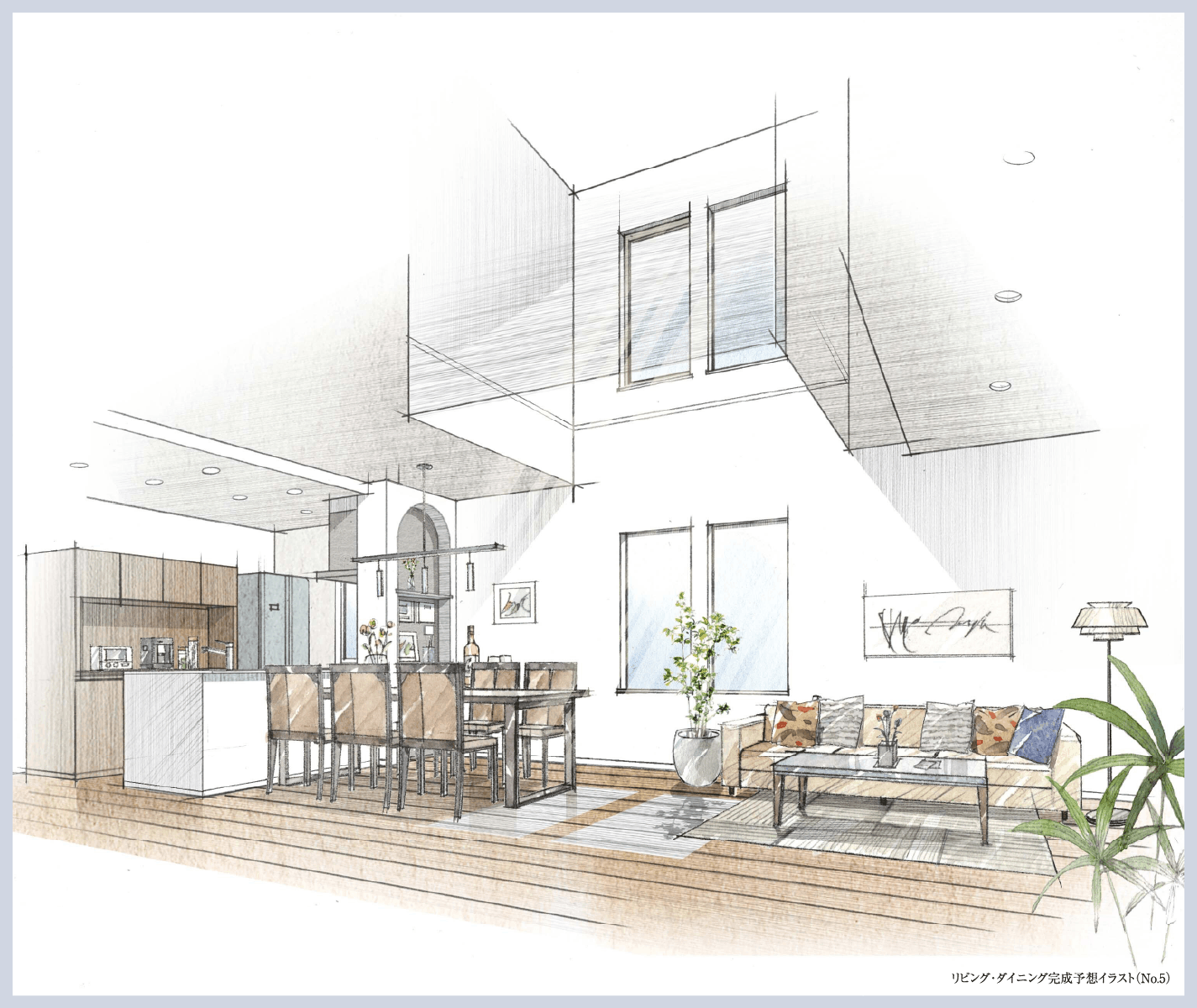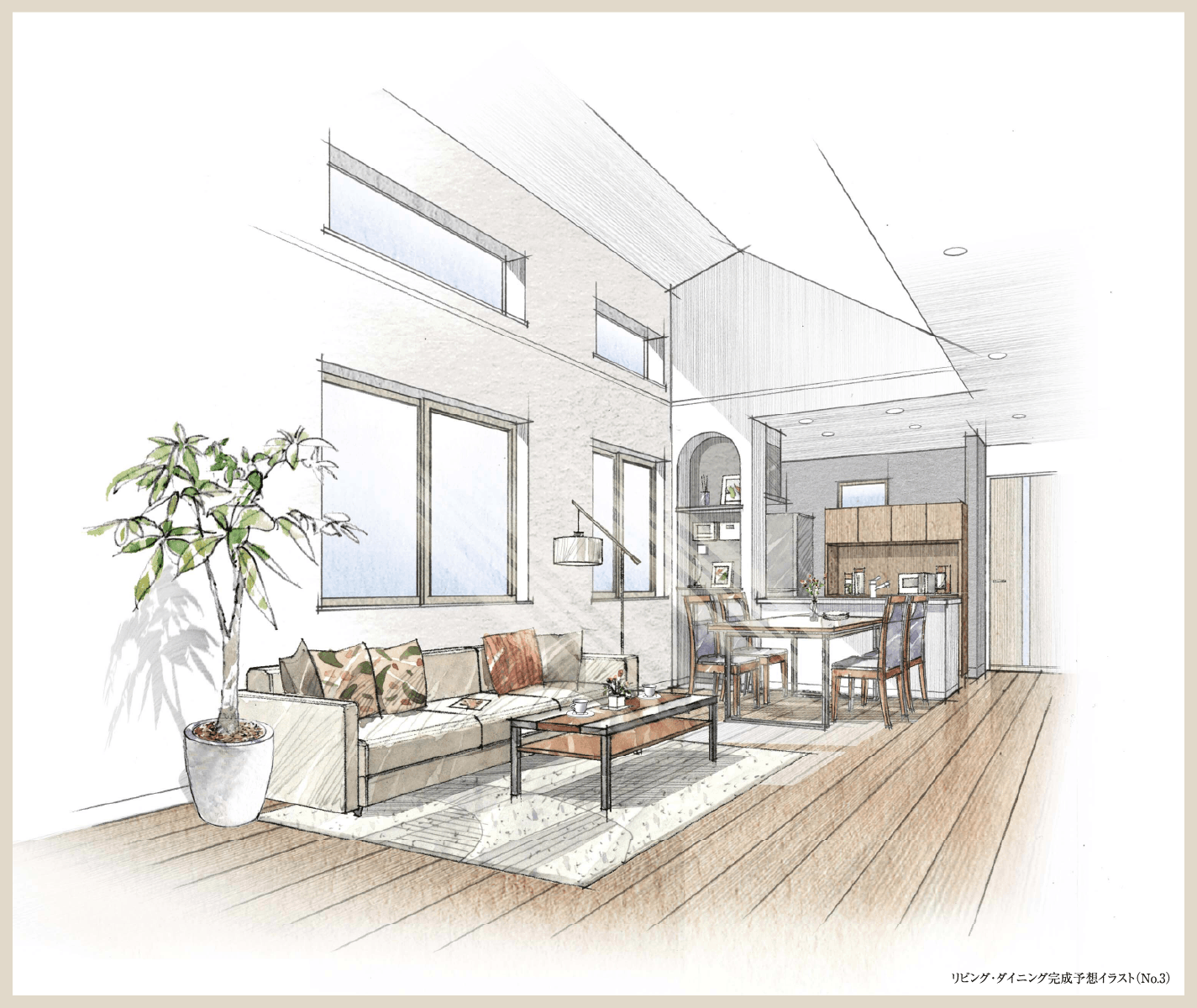 ※掲載の完成予想イラストは、設計図を基に作成したもので、形状・色等は実際とは異なります。なお、外観形状の細部、設備機器等は表現しておりません。家具・調度品等は販売価格には含まれません。予めご了承ください。