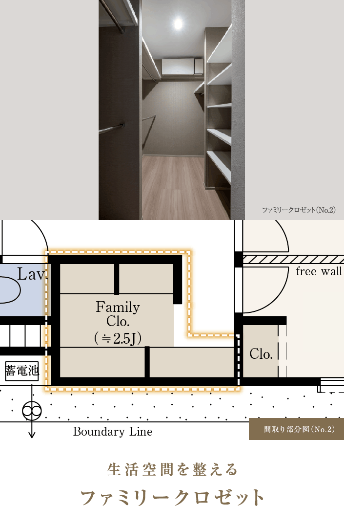 1階には「ファミリークロゼット」を設置。荷物を居室に持ち込むことが少なくなるため、生活空間をすっきり保てます。