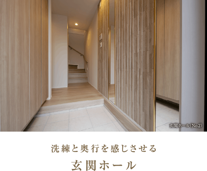 玄関ホールの壁には消臭等の機能も持つアクセントタイルと奥行きを演出するミラーを採用。優雅な住まいの“顔”を描き出しています。