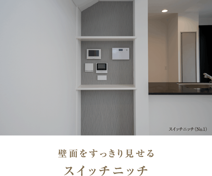 インターホンやスイッチをまとめた「スイッチニッチ」。メモや伝言用のマグネットボードとカウンターも併設しています。