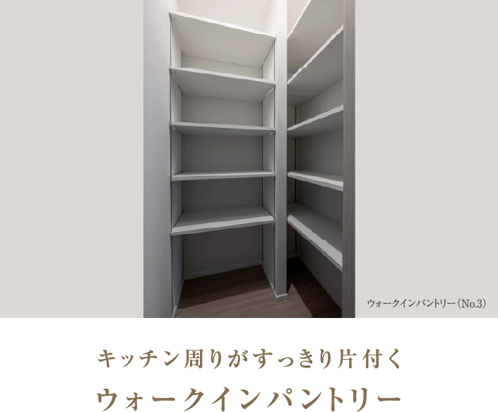 ペットボトルや食料品、調理器具、非常食などをまとめて収納可能。家事を効率よくサポートする収納空間です。