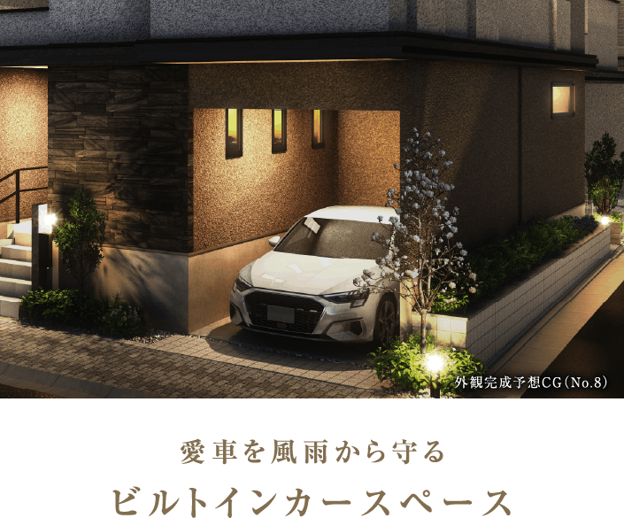 一部住戸にはビルトインカースペースを用意。愛車を風雨や紫外線から守ります。