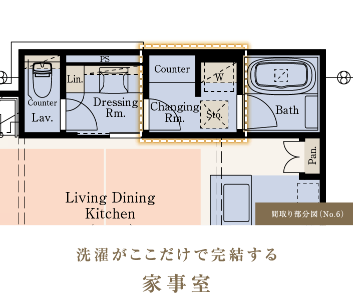 No.6には家事室を用意。洗濯物を畳むのに便利なカウンターを設置し、日々の家事を快適にサポートします。