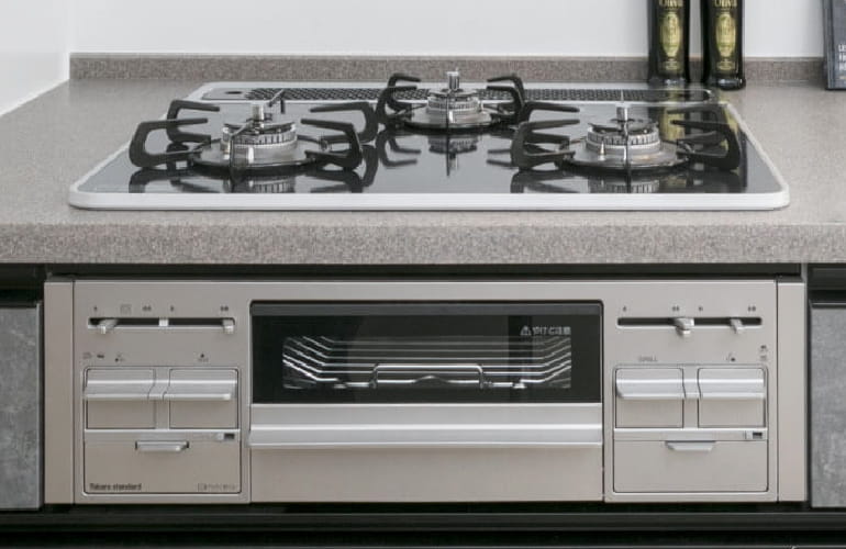 お手入れのしやすいガラストップコンロを採用。さらに、魚を美味しく焼ける、水なし両面グリルも装備しています。