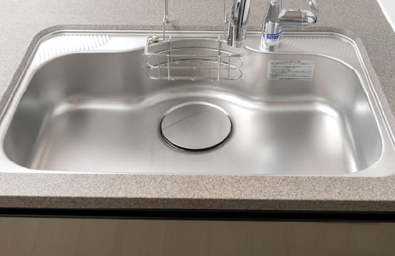 水道水や食器がシンクにあたる音の響きを低減する静音シンクを採用。大型の鍋なども洗いやすい幅広のワイドシンクです。