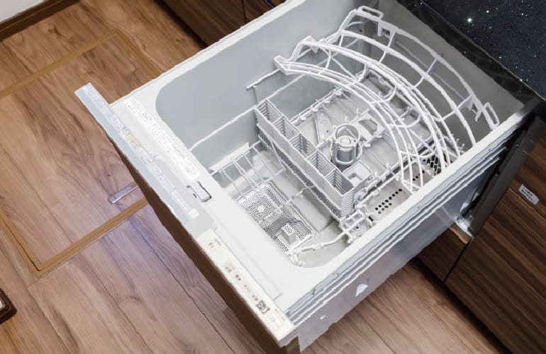 引き出し式で食器の出し入れが容易なビルトインタイプ。食器洗いの手間を省き、電気・水道代の節約に貢献します。